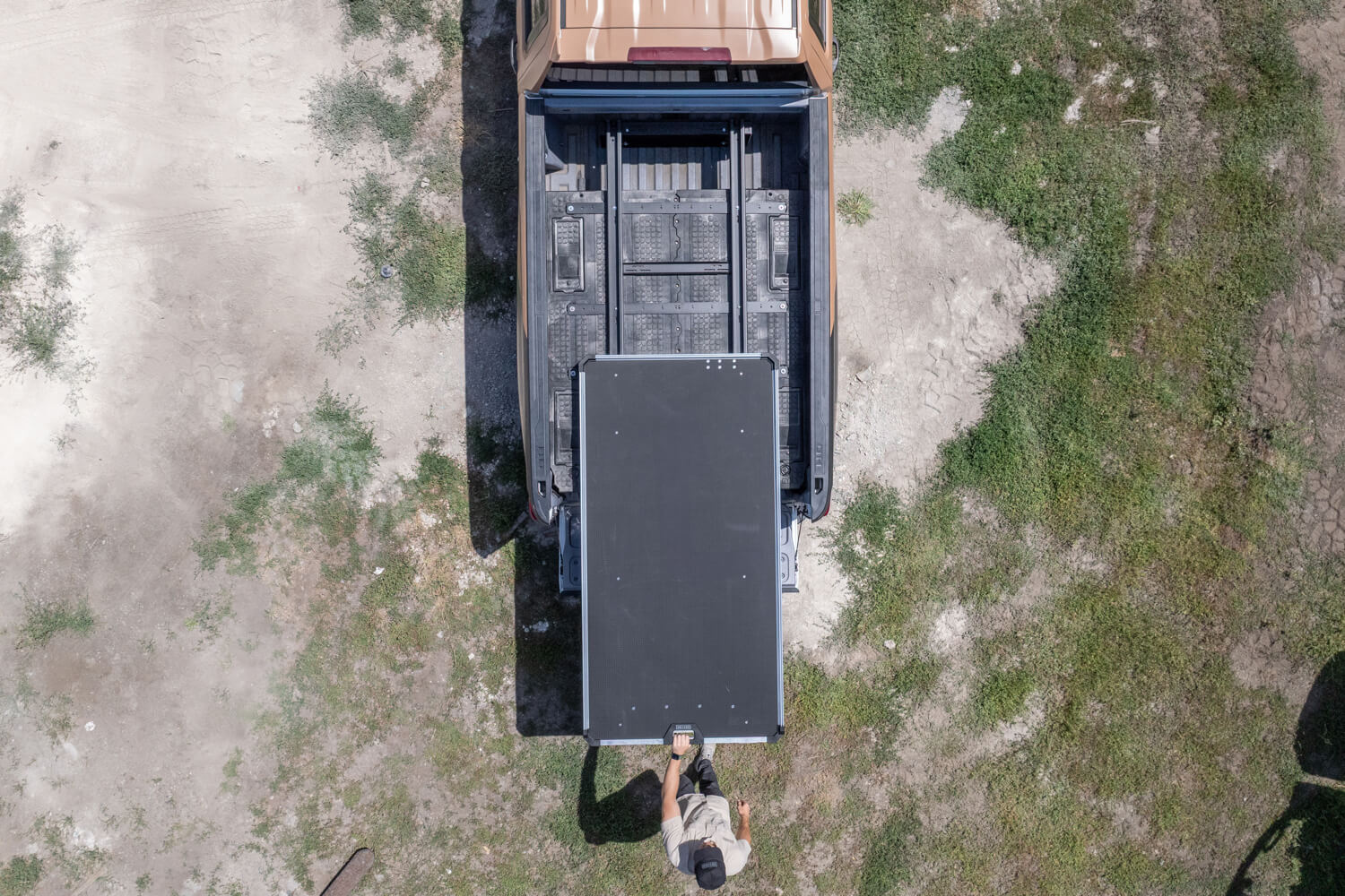 The ergonomic truck bed storage solution. Secure drawers below, full-width cargo deck above, light and tough.